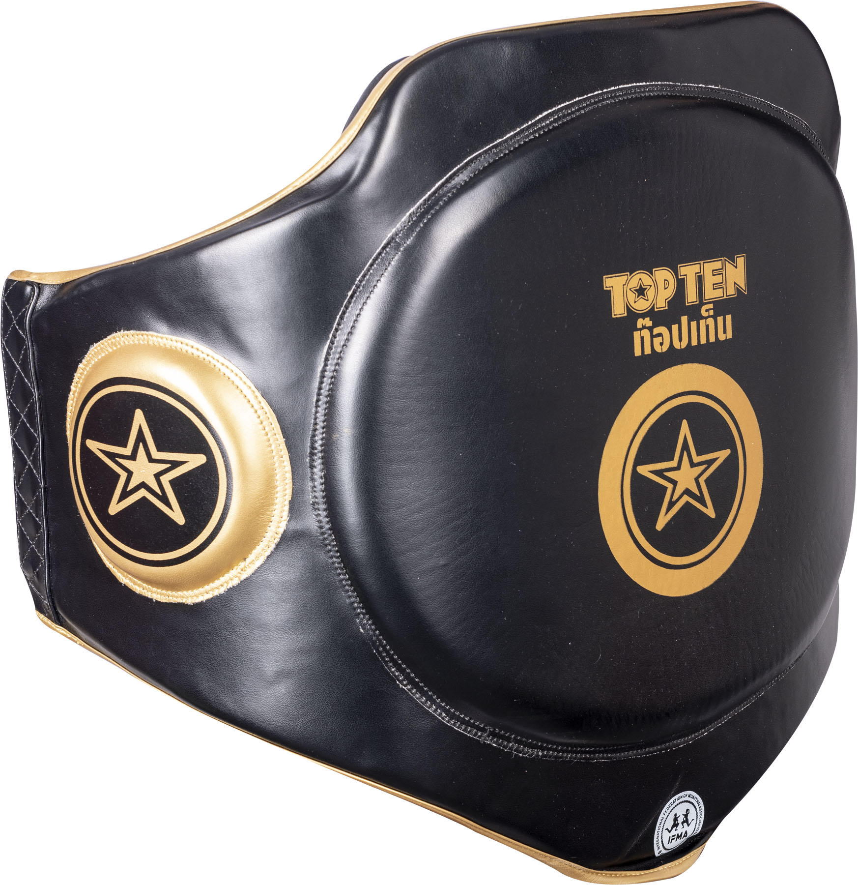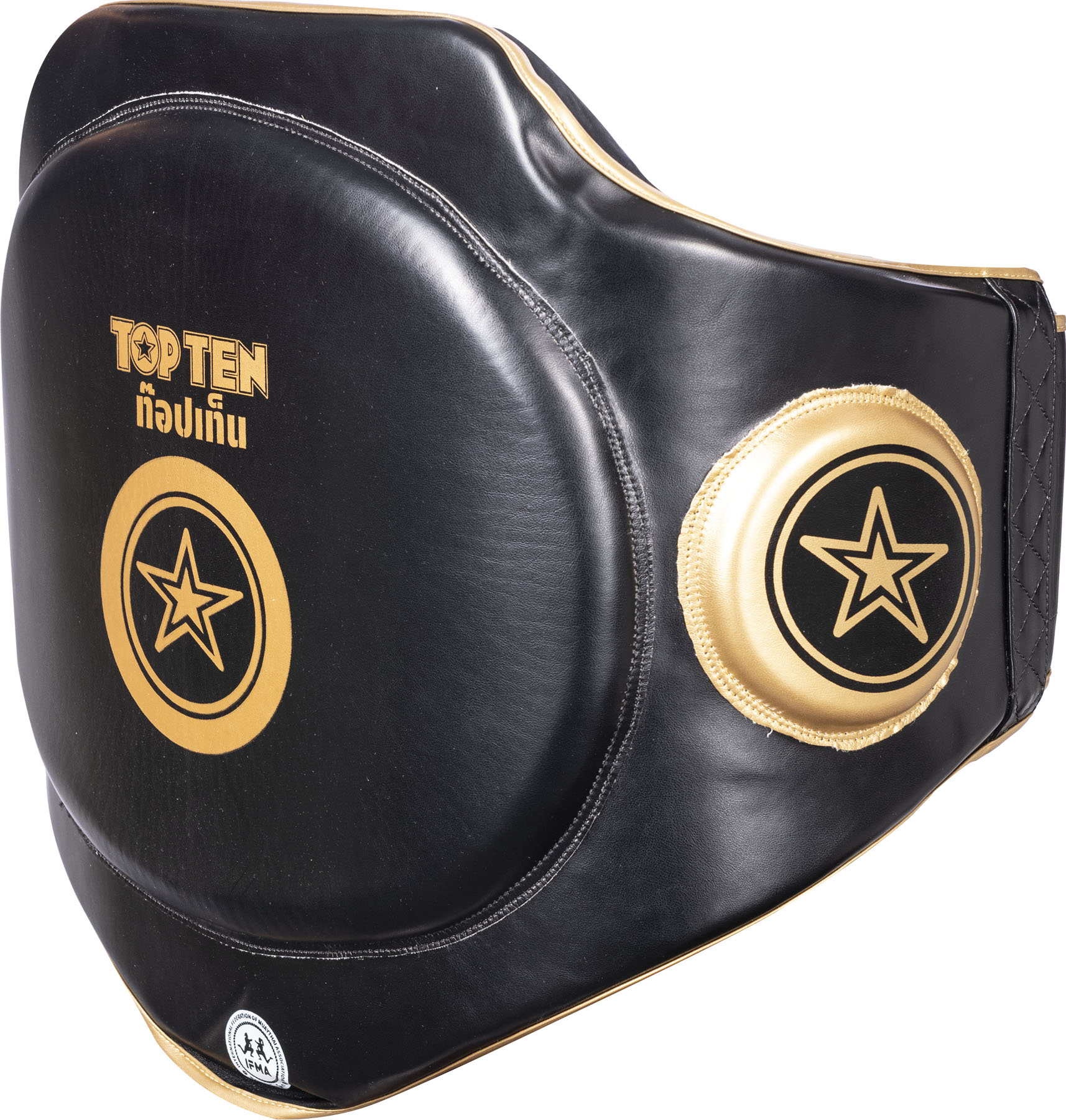 The IFMA belly shield “Naa” from TOP TEN in the full-contact sport Muay Thai provides more than just a good feeling. The abdominal protector, equipped with a 5 cm continuous padding, protects against severe abdominal injuries during training. The protector lies comfortably thanks to the anatomical shape, and additional reinforcements on the striking surfaces ensure maximum safety. To avoid skin irritation, the “Naa” belly shield has a soft, sweat-wicking inner lining. A comprehensive and robust hook and loop fastener keep the belly belt securely in place.
