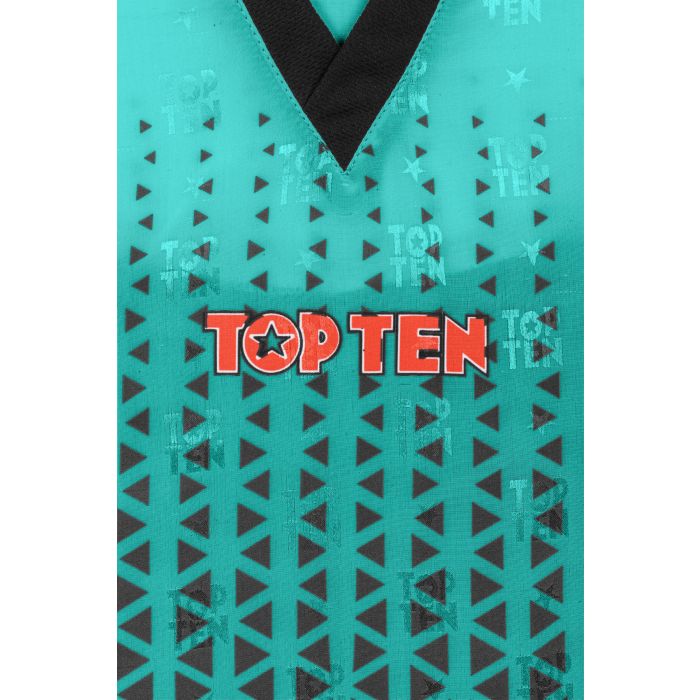 The still very young past of the sport brings the kickboxing also a fresh and informal outfit. With the kickboxing uniform “Grafic” Top Ten has created a functional suit with many valuable details. On the shirt, you will especially notice the collar. With the sporty V-shape and the high passage in the neck, it brings both lightness and safety. The shoulder area is cut wide to allow your movements in full dynamics and speed. Together with the long pants, which fits perfectly through the wide and elastic waistband, you are fully equipped. Also when cutting the pants Top Ten has thought of everything. While the loose overall fit makes it easy to “push through” protective gear, the narrow leg cuff prevents you from slipping up during your kicks. Visually, the kickboxing uniform “Grafic” has a lot to offer and is available in 6 different color variants.
