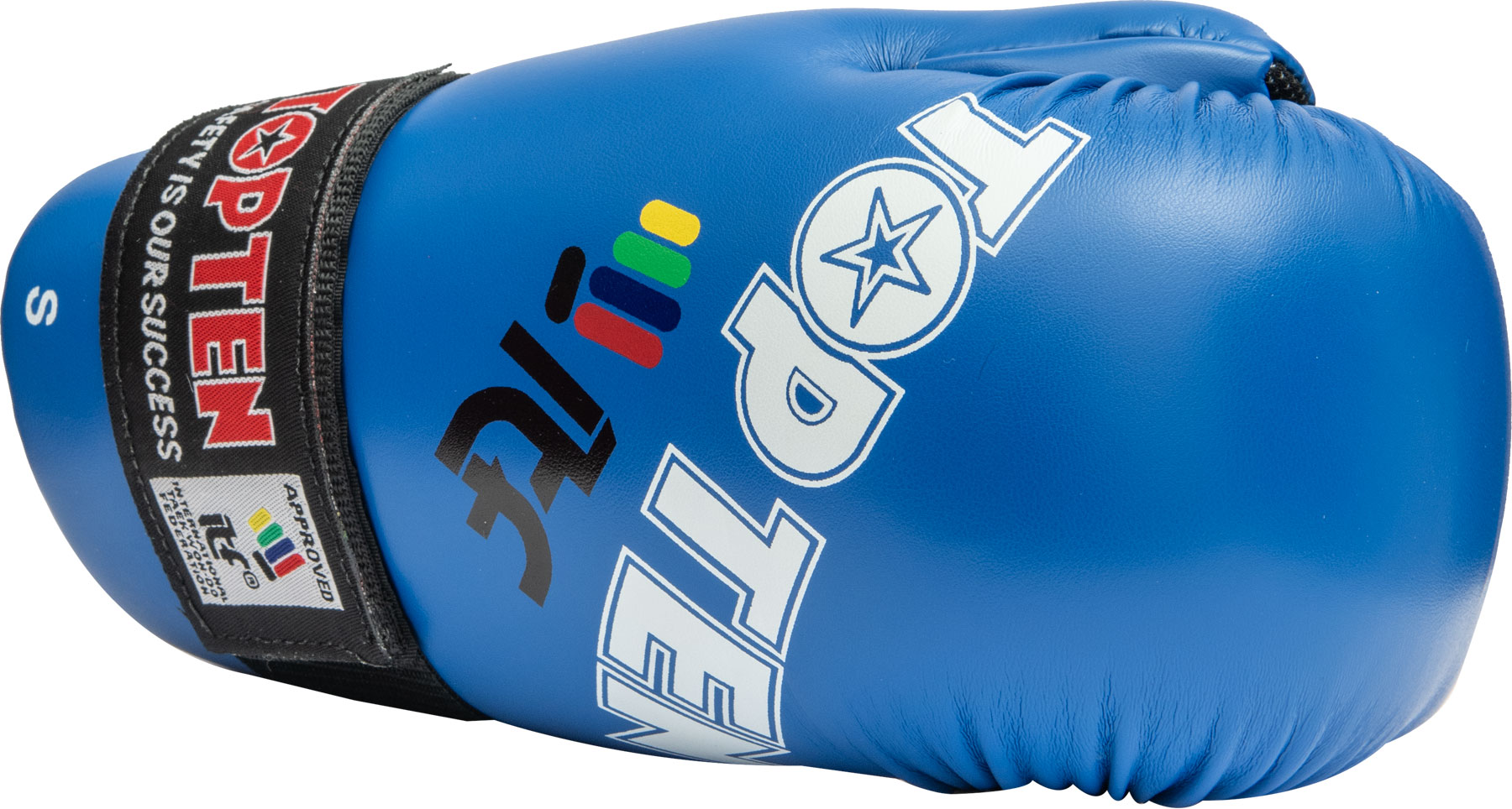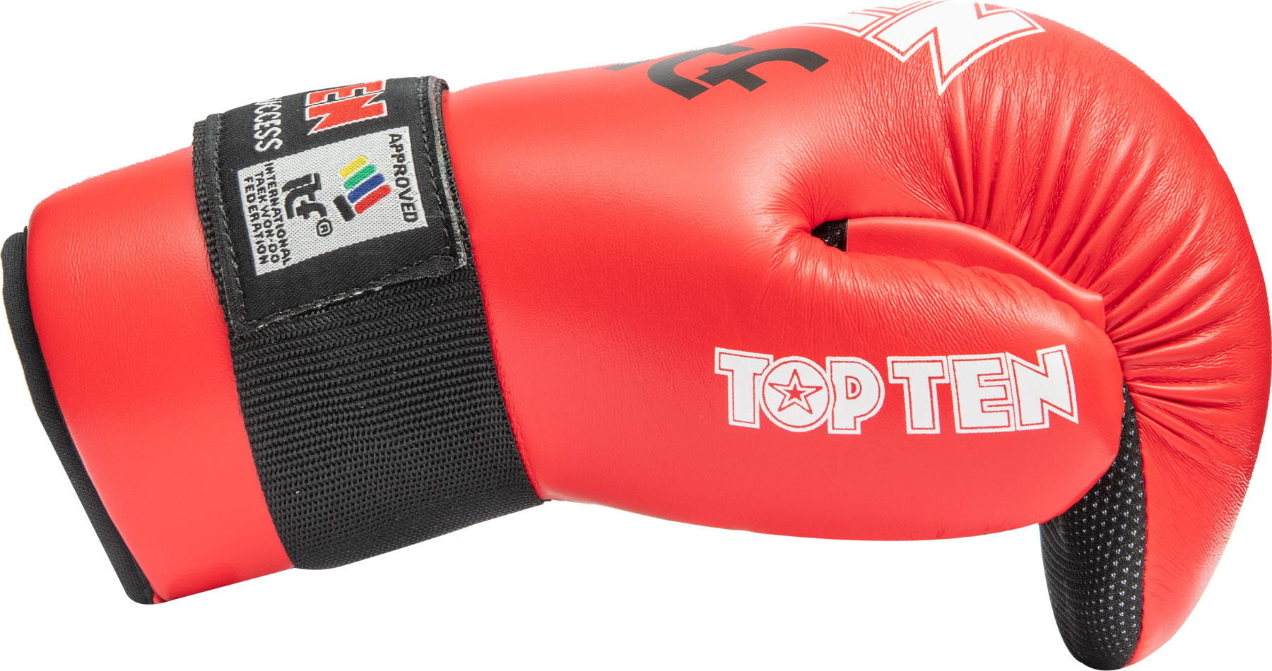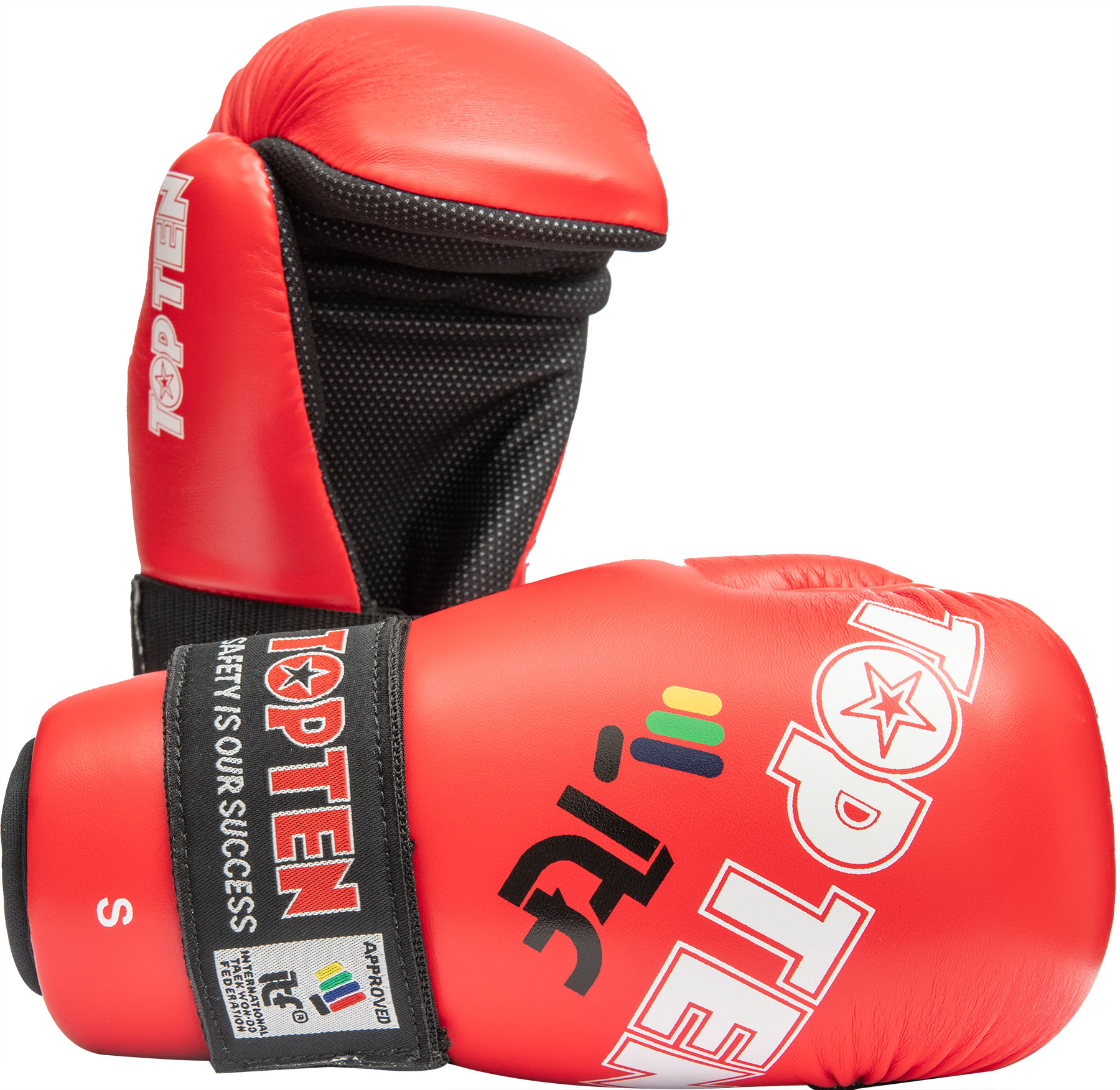 Approved for ITF competitions in Taekwon-Do, the Open Hands “ITF” is a real highlight from TOP TEN. With a cover made of hard-wearing artificial leather on the outside and skin-friendly inner material, the “ITF” is a successful combination of functionality and wearing comfort. The sewn-on thumb increases safety performance, while the extra-long shaft and the strong fastening strap optimize the fit of the open hands. In terms of design, TOP TEN is based on the well-known competition colors red and blue for the “ITF” Open Hands. TOP TEN brand lettering and ITF motif give the gloves a timeless outfit with a sporty character.