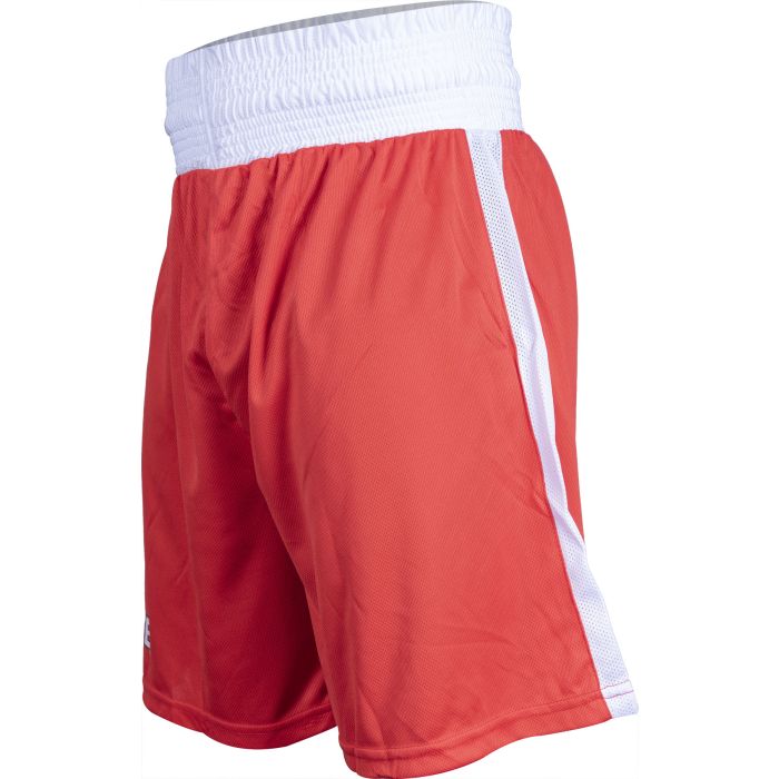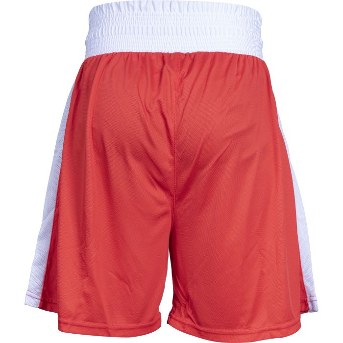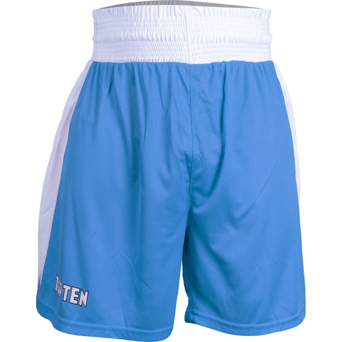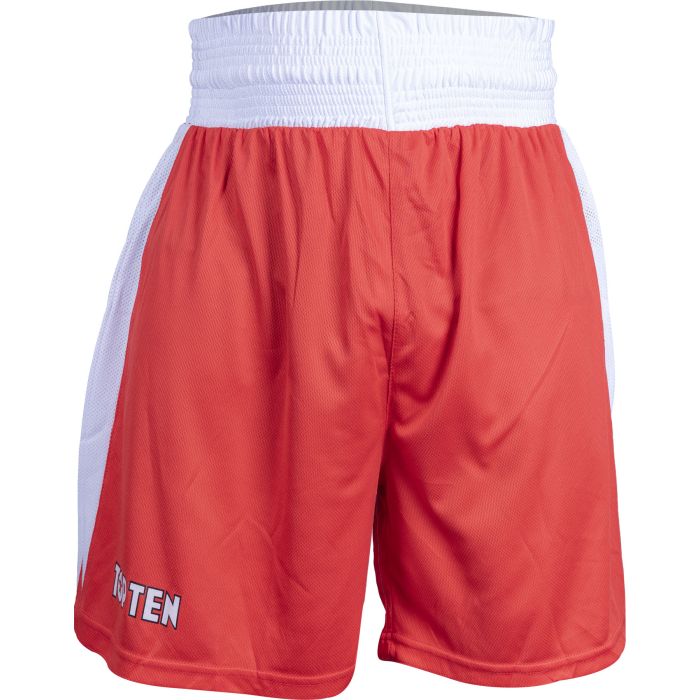 Show your best form in the ring in the “Competition” shorts from TOP TEN. A white comfort waistband and cool mesh stripes on the sides complement the red or blue design. With 100% polyester, the “Competition” is one of the exceptionally light sports shorts in the tried and tested IBA style and is highly durable. The straight cut and extra flat seams make the “COMPETITION” comfortable to wear at the highest level of performance. The open fiber structure ensures constant air exchange so that the “Competition” shorts are compelling in training, sparring, and competition.</p