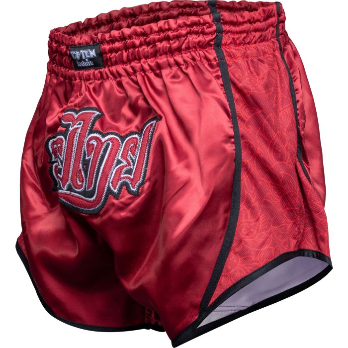 Con i pantaloncini da boxe thailandese TOP TEN ‘Nong Han,’ sei sempre ben equipaggiato per l’allenamento di arti marziali. Che si tratti di boxe thailandese, kickboxing, boxe o fitness, la tua mobilità è sempre la priorità assoluta per questi pantaloni sportivi. Con i ‘Nong Han,’ alleni coordinazione, velocità di reazione, forza, resistenza e mobilità in una libertà illimitata. È anche intransigente quando si tratta di comfort e stile. Con elementi floreali filigranati e scritte in Thai, garantisci di farti notare – anche fuori dal ring. Il taglio extra corto e ondulato rende superflui i tagli laterali aggiuntivi. Le cuciture robuste danno ai pantaloni leggeri e funzionali in fibre sintetiche una lunga durata di vita.